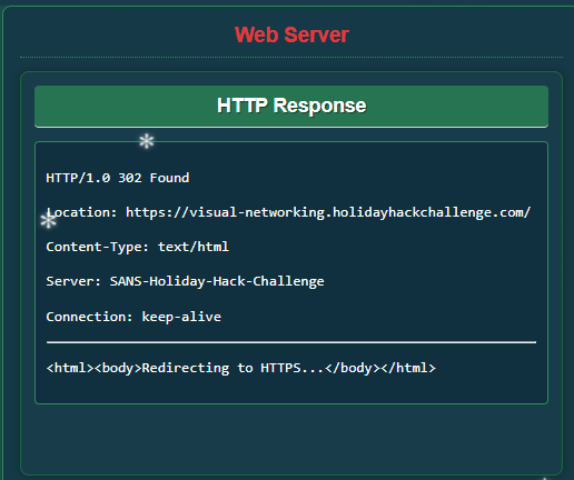 The first challenge is to find the IP address of visual-networking.holidayhackchallenge.com and they provide a table to do so. I inserted an IPv4 address lookup over port 53 (Standard DNS port) and got:
