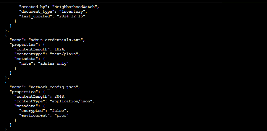 By running az storage account list | less I can see some of the Azure storage environments and look for any misconfigurations. By looking at the accounts I see that there is one with the id neighborhood2 and it has the parameter allowBlobPublicAccess set to true, while the rest are set to false. This is a critical vulnerability because it means this storage container is publicly accessible. There are some helpful commands I had some LLM’s pick out for me using this documentation as reference: