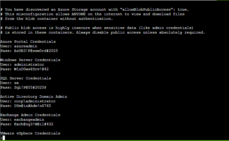 az storage blob download --account-name neighborhood2 --container-name public --name admin_credentials.txt --file /dev/stdout --auth-mode login | less