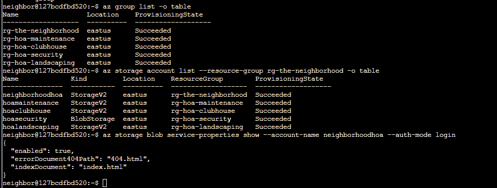 Additionally I want show all the group resources I have access too, list storage accounts in the specific neighborhood group I want (going for neighborhood-hoa), and try to see if there is a specific static website that has hosting enable in said storage account.