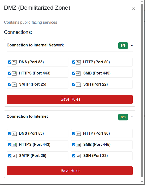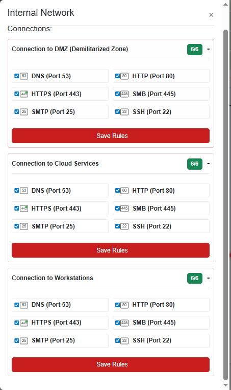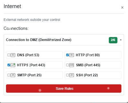 This Challenge is really easy. It is just going through and selecting what connections should be allowed on which ports for the following network map, I am just going to include screenshots on which connections are allowed and on which parts of the network: