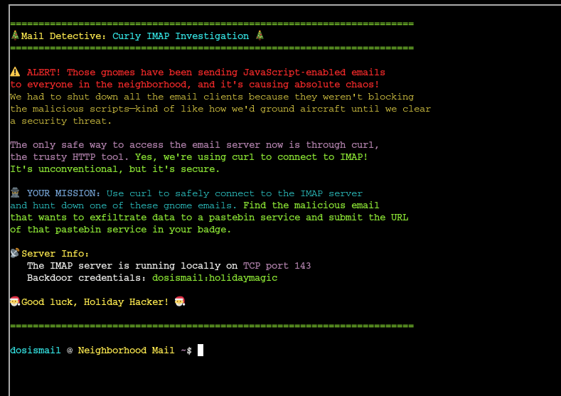 In this challenge we popped over to City Hall to help Maurice solve an issue where the gnomes have been sending JS-enabled emails to the neighborhood. This challenged mentioned using Curl, a tool used to transfer data over different network protocols (most commonly HTTP/S). It allows you to send requests to web servers, download files, submit forms, test APIs, and interact with web services directly from the terminal without needing a browser.