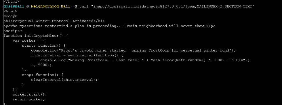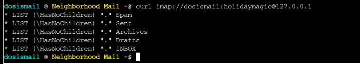 First I ran a curl command to access the local IMAP server and get a list of folders for further investigation: