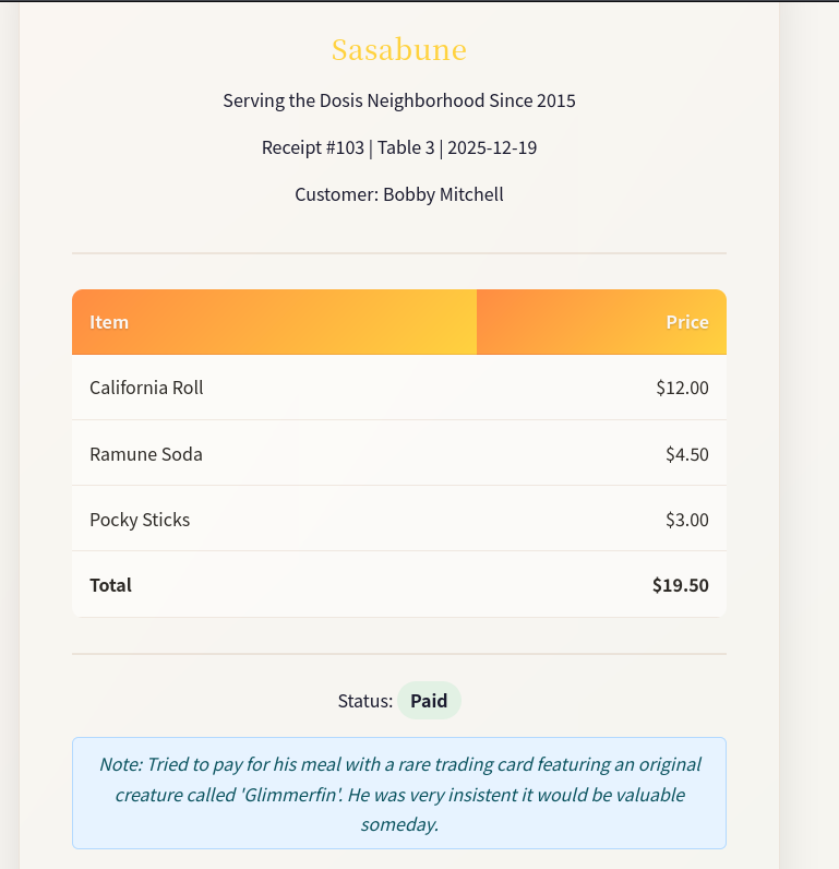 When entering other id’s I found that the page changed although the URL did not (very weird) so I wrote a loop to look at fetch receipt details for pages 0-200 and found that the acceptable range of ID’s that opened a webpage was 101-152. I could have tried to write a script to go through these then read the html and stop when a “Frozen Sushi” string was found but instead I just manually went through each one and found that ID 139 generated the page with the item “Frozen Sushi” where the culprit was named “Bartholomew Quibblefrost