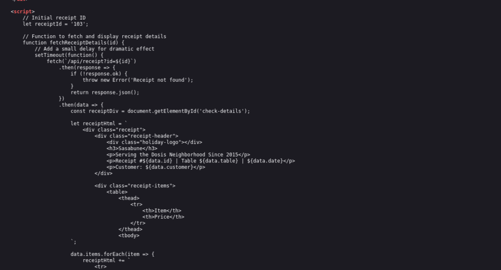From talking with the Owner of the Sushi bar I learned I am looking for a customer that ordered Frozen Sushi so the plan is to to look for a receipt that says that. Taking a look at the pages HTML I saw some JavaScript that has a function that takes the receipt ID as input: