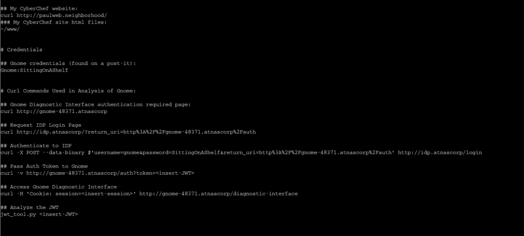 here I found out that our friend Paul in the local park has access to a gnome’s diagnostic interface with some credentials but it’s a low privilege account. I needed to figure out how to escalate those privileges to see what malicious firmware the gnome’s are downloading. Paul also gave me some helpful notes: