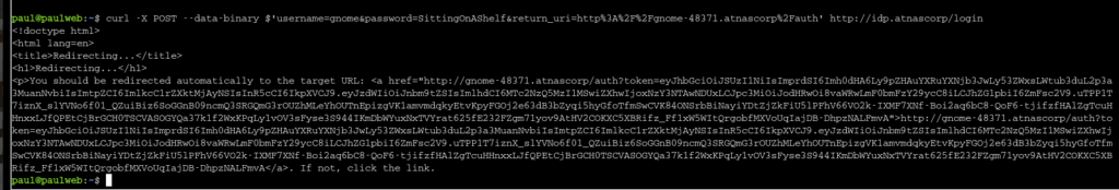 First I’ll start by using the cURL command to look at the JSON Web Token (JWTs) and I got one: