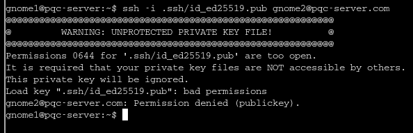Taking this key I can log into the server as the gnome1 user with ssh -i .ssh/id_rsa gnome@pqc-server.com and looking at the hidden .ssh server again I see another rsa id but this file has permissions set so that I can’t use it to ssh as that user:
