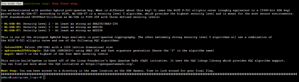 Again following the same process as before I was able to log in as gnome4 and there found a ML-DSA-97 key which allowed me to log in as an admin: