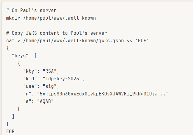 After running this the resulting jwks.json will contain the public key in the format the web server will accept. The gnome server needs to fetch my JWKS. Since direct network access from Gnome to my Kali machine isn’t available, I hosted it on Paul’s web server (which is on the same network as the Gnome server, also note that n is the value of the jwks public key I made):